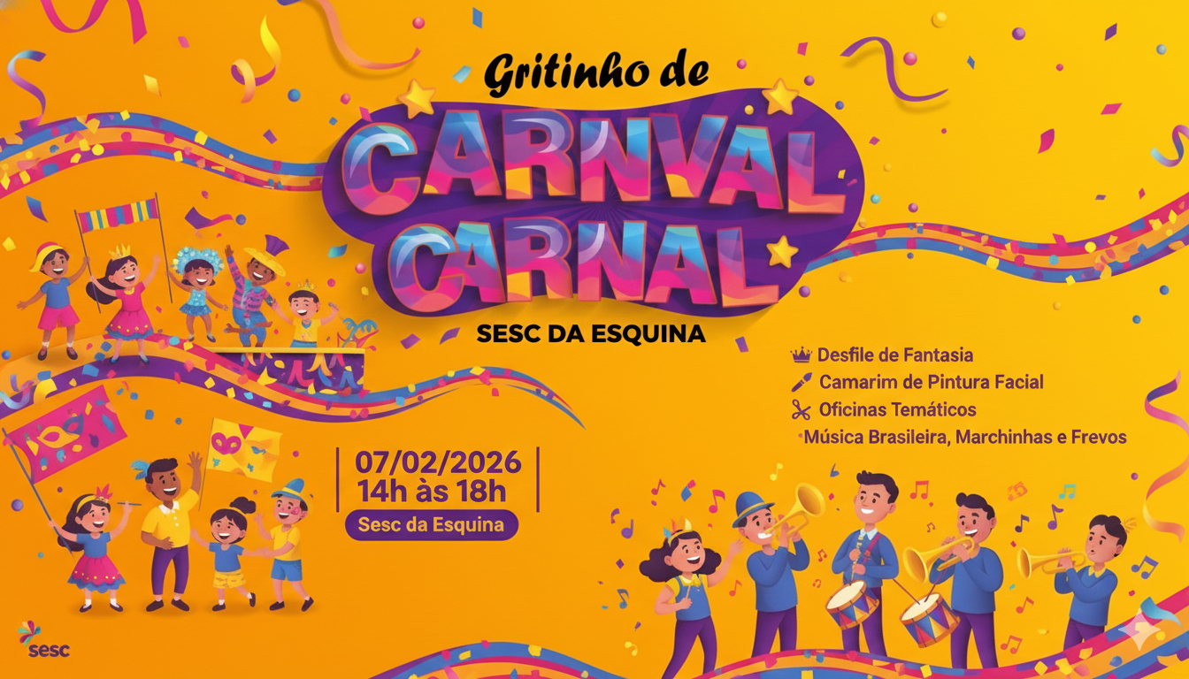 O Sesc da Esquina promove a quarta edição do Gritinho de Carnaval! Em 2026, o evento promete uma folia brincante e contagiante, preparada especialmente para proporcionar momentos de alegria a toda a família.